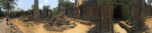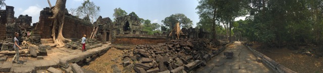 After a quick stop at the gas station for a coffee and bottles of water, we zipped off to purchase our day passes, and then off to see he sunrise at Angkor Wat. Below is a pano taken shortly after sunrise of Angkor Wat. You can see LL in her blazing red pants (of course!) 😉